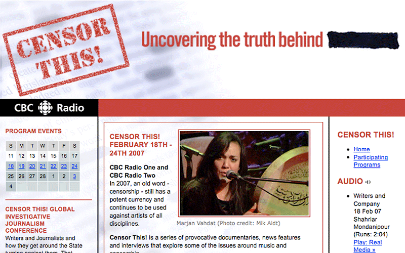 Site design & front-end development for CBC's documentary series on music and censorship. TV ad for site. (Runs 0:16).