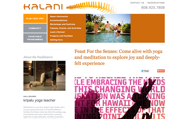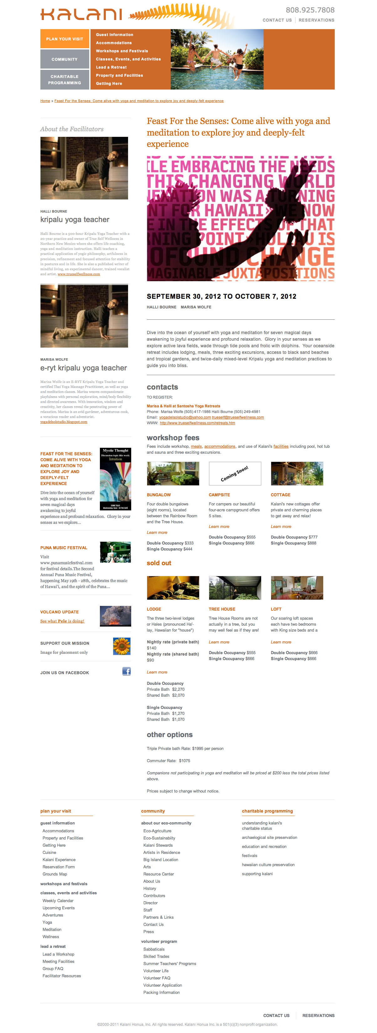 Six month on site contract at Hawaiian retreat centre. Architecture, design of outward facing pages & admin forms based on templates, interactive features like class calendar and accommodations grid, localization & mobile development. Drupal.